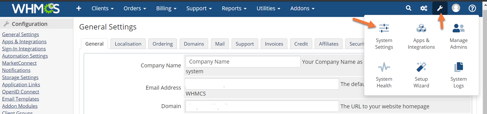 Step 1) First, log in to your WHMCS Admin. Once logged in, click the wrench in the top right corner, then click System Settings.