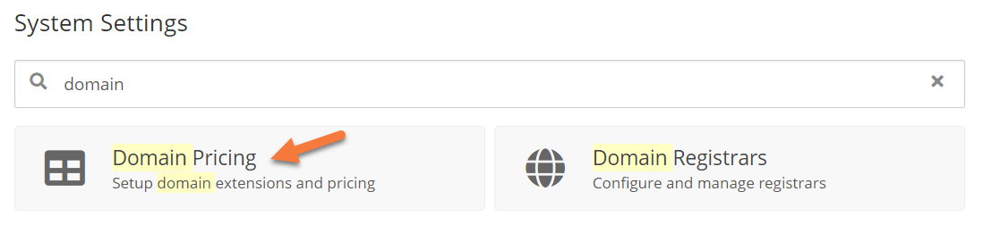 Step 2) Once the System Settings panel loads, use the search feature at the top of the page to search for domain; then when the results load, click Domain Registrars.