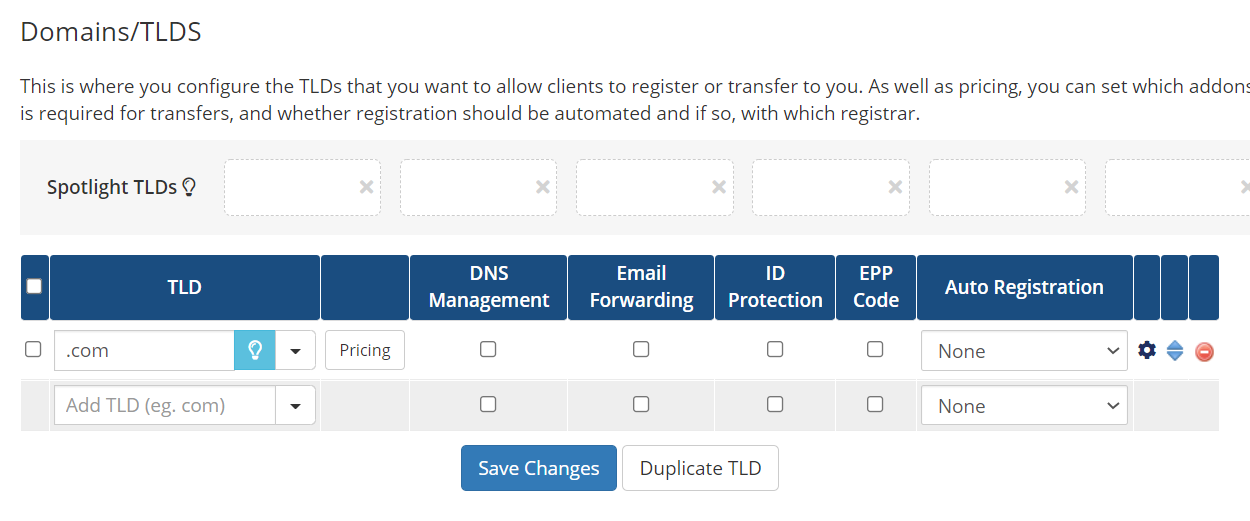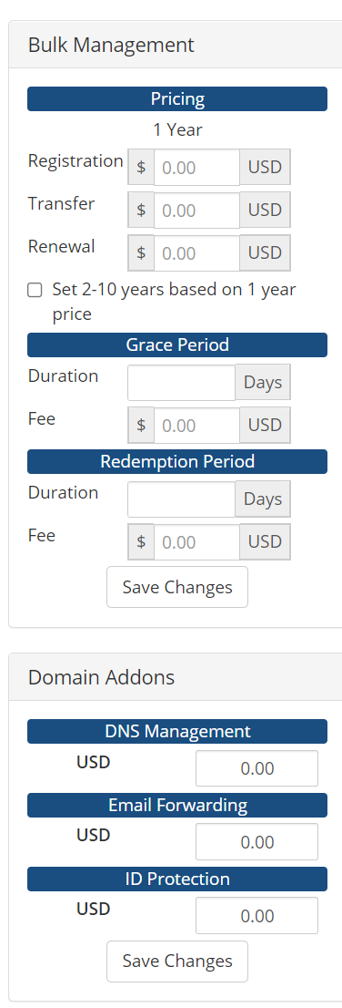Finally, if you offer domain addons, like DNS Management, Email Forwarding, and ID Protection, you can set the price of those options here.