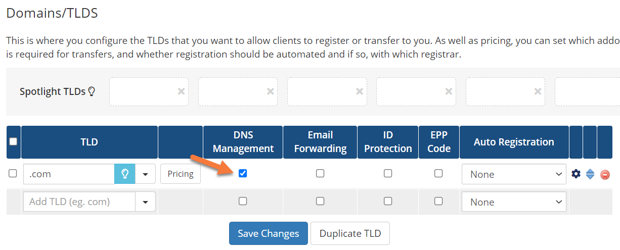 Step 3: If you want your customers to be able to control things like their DNS, Email Forwarding, ID Protection/WHOIS Protection, and request their EPP Code, you’ll need to tick the checkboxes for those options in the table for each TLD listed.