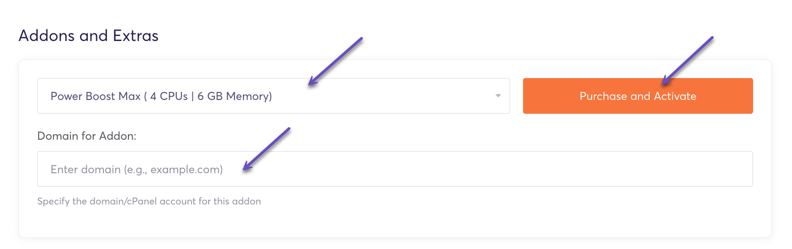 3) On the Product Details page, scroll down to the Addons and Extras section and select your desired Power Boost tier: Power Boost Plus (3 CPUs | 4 GB Memory) or Power Boost Max ( 4 CPUs | 6 GB Memory).