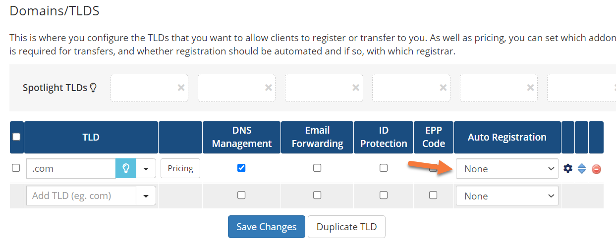 Step 3: If you want your customers to be able to control things like their DNS, Email Forwarding, ID Protection/WHOIS Protection, and request their EPP Code, you’ll need to tick the checkboxes for those options in the table for each TLD listed.
